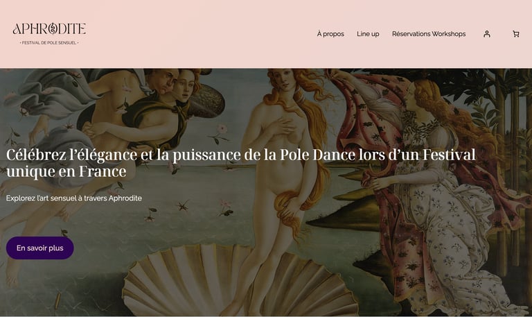 Conception du site aphroditefestival.fr : design sur-mesure, univers visuel fort, navigation fluide, calendrier interactif, mise en avant des artistes, billetterie intégrée et version mobile optimisée. Un site pensé pour créer l’émotion et inciter à l’action.