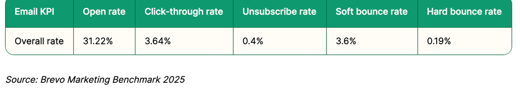 👉 Chez Klaviyo, la moyenne e-commerce de leurs quelques 167 000 clients en 2025 est de 37,93% d’ouverture et 1,29% de clics.